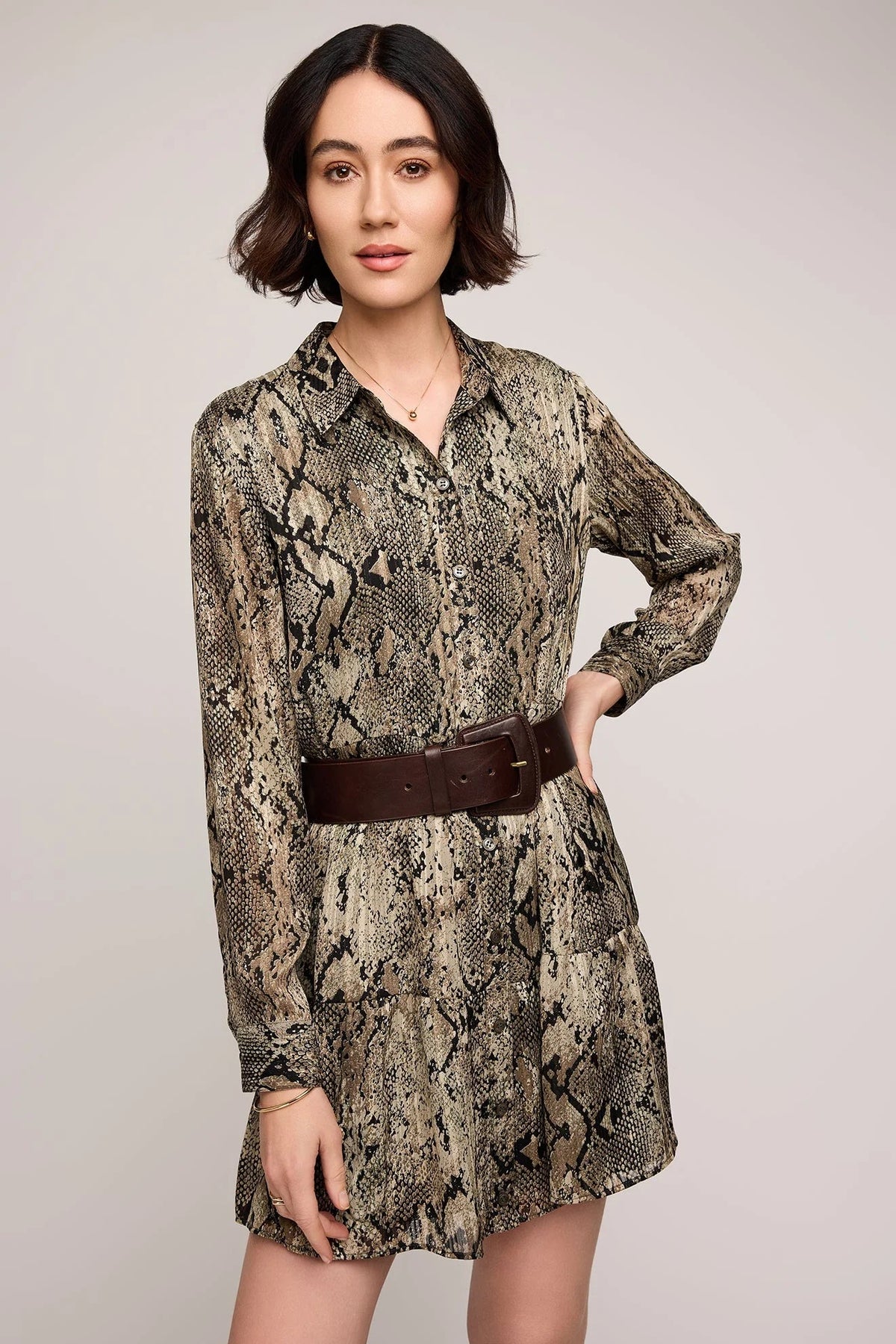 at CheckoutEffortlessly feminine, the Vesper Dress by Gentle Fawn is made from a lightweight lurex stripe chiffon with a custom in-house jade snake print. Designed with a flattering mini length and functional button front, this piece moves easily from day to night. The fully lined body ensures comfort and coverage, while subtle shimmer in the fabric adds a touch of understated glam. Pair it with heeled boots or sleek sandals for a polished look all season long.