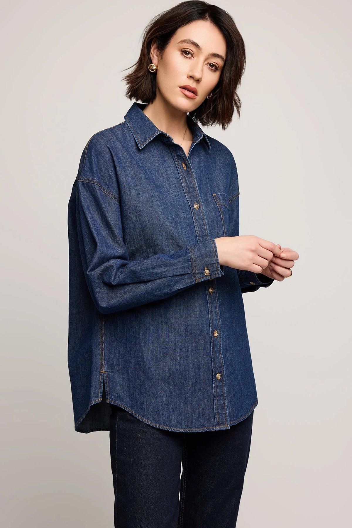 The Whitney Shirt is a timeless denim button-down that brings effortless style to your everyday wardrobe. Crafted in a rich dark wash, it features a relaxed silhouette with classic tailoring — a pointed collar, button-front closure, and adjustable cuffs. Soft yet structured, this versatile piece can be worn on its own, layered over a tank, or styled open as a lightweight jacket.