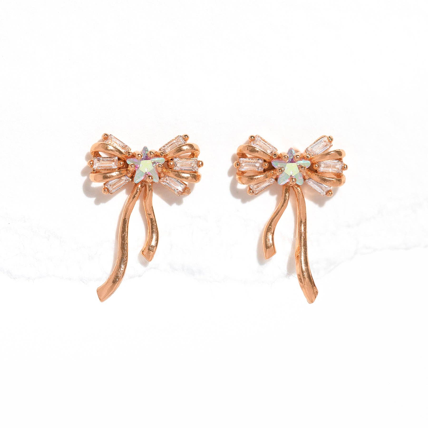 These charming bow earrings are your ticket to instant elegance with a playful twist. Featuring sparkling cubic zirconia stones set in your choice of 18k gold plating, rose gold plating, or rhodium plating over brass, they deliver sophisticated style without the fuss. Comfortable sterling silver posts with secure butterfly backings ensure they stay put all day long. Whether you're dressing up or adding a touch of whimsy to your everyday look, these beauties strike the perfect balance between refined and fun.